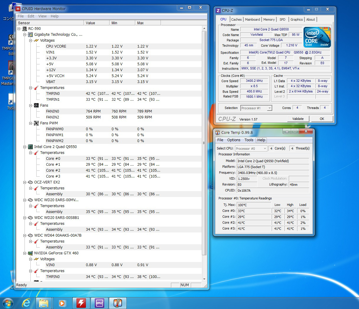Core Tempで34℃/29℃/41℃/41℃ ↑クリックで拡大