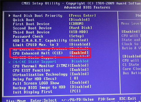 CPU Enhanced Halt (C1E)を[Enable]から[Disabled]に変更。
