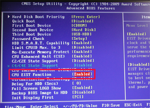 CPU EIST Functionを[Enable]から[Disabled]に変更。