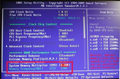Memory Frequency(Mhz)の左側の数字(この場合は1333)を超えないように設定すること。