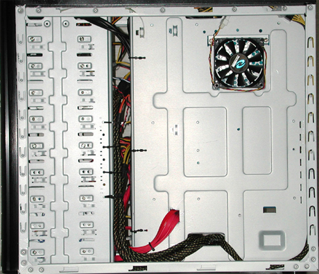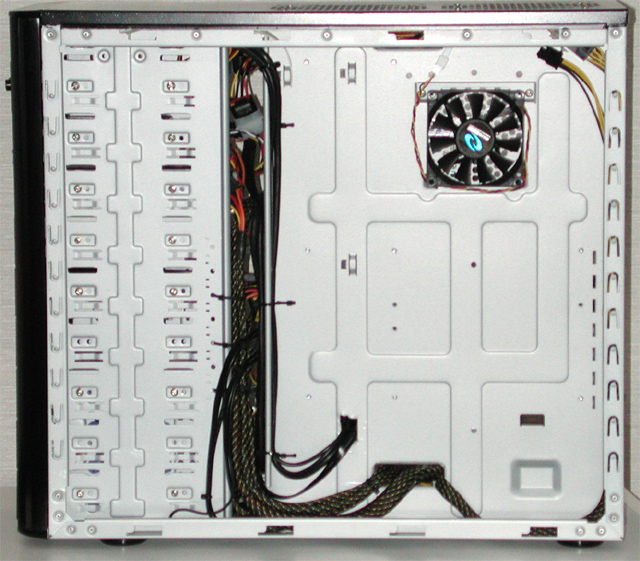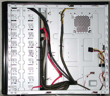 このケースは電源を上側に設置する通常のケースとは違い、電源を底部に取り付けて更にケーブルを裏側に配置することでエアーフローを良くしています。