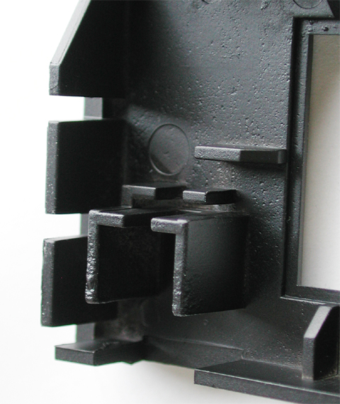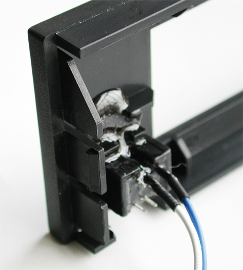 出っ張りの表側にプッシュスイッチの頭が出るように穴を開け、リセットスイッチを瞬間接着剤とエポキシ接着剤で固定しました。