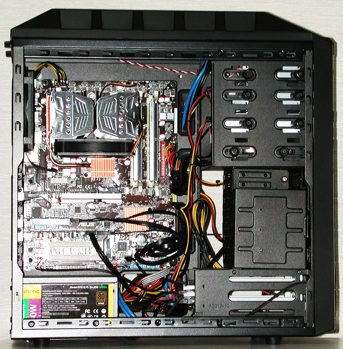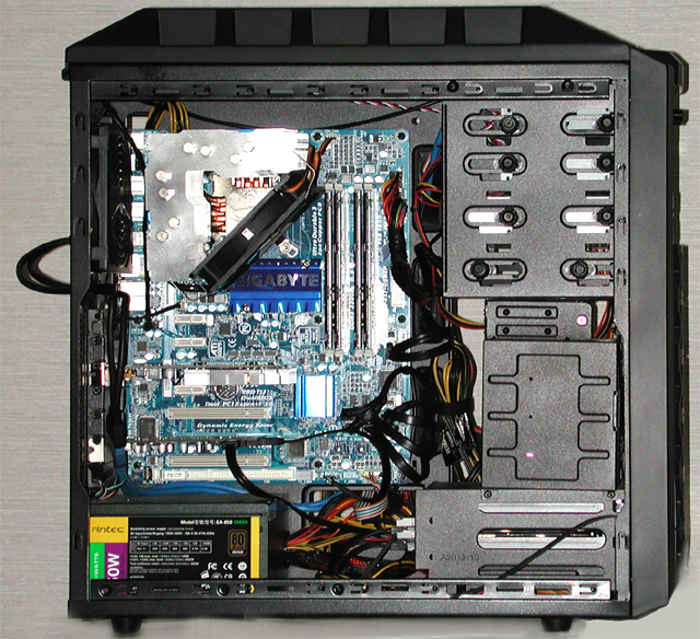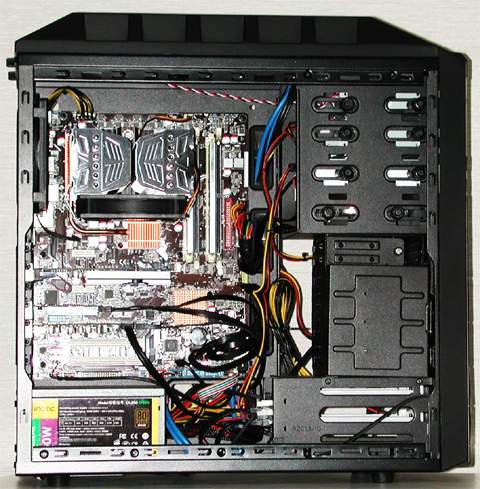 マザーボード、電源、インターフェイスカード、HDD、ビデオカードを組み込みます。今回はUSBからOSをインストールするのでDVDドライブは無しです。