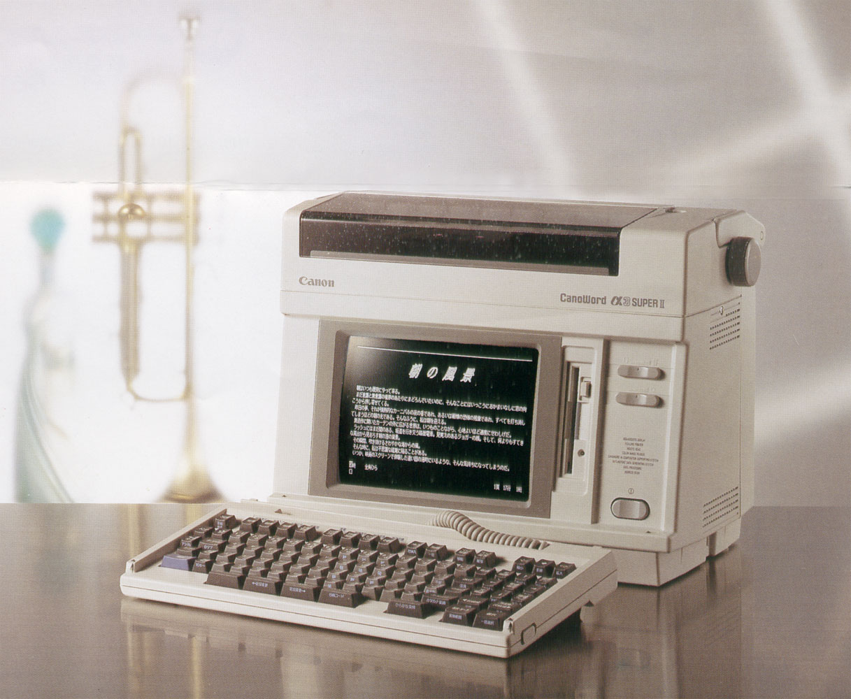| 48ドットが主流だった当時、56ドットと綺麗に印字できるのと、前の機種で作ったデータがそのまま使えるということで決めた機種。 実はこの機種の前に黒色のキヤノワードα3SUPERという機種が発売されており、買おうか思案しているところでした。 白色になりSUPERUとなって直ぐに飛びつきました。前の機種と比べると、画面が大きくて見易く、良い買い物だったと思います。 重量は約11kgと結構重かったのですが、会社に持っていったことも何度かありました。 |