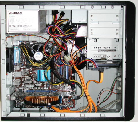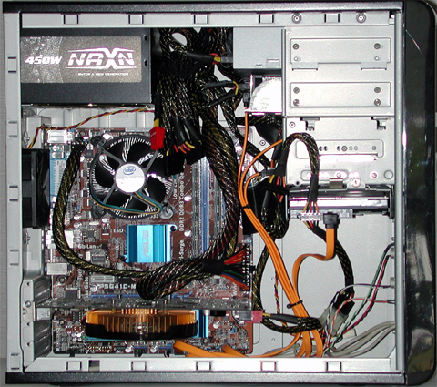 ATXマザーボードからmicroATXマザーボードになったので、ケースの下側にスペースができてしまいました。また、いろいろな環境を試せるように起動ドライブにはリムーバブル方式のカセット式にしました。今、話題のSSDも試しに使っています。