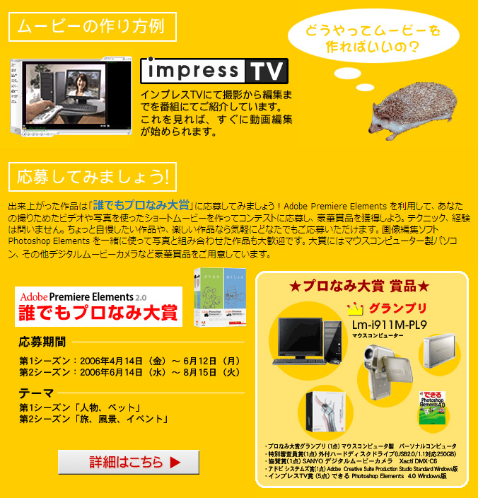 そんな中、2006年4月頃インターネット上である編集ソフトを使ったビデオの作品コンテストを知りました。AdobeのPremiere Elements 2.0とPhotoshop Elements 4.0を使用する「誰でもプロなみ大賞」というコンテストでした。