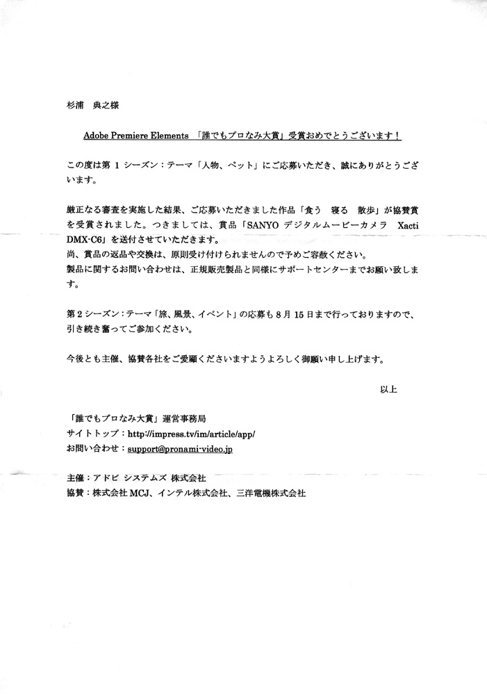 結果はテーマ「人物、ペット」の第1シーズンが「食う 寝る 散歩」という作品で協賛賞、賞品がデジタルムービーカメラ、テーマ「旅、風景、イベント」の第2シーズンが「もっと、時間を・・・」という作品で特別審査員賞、賞品外付けHDDをいただくことができました。